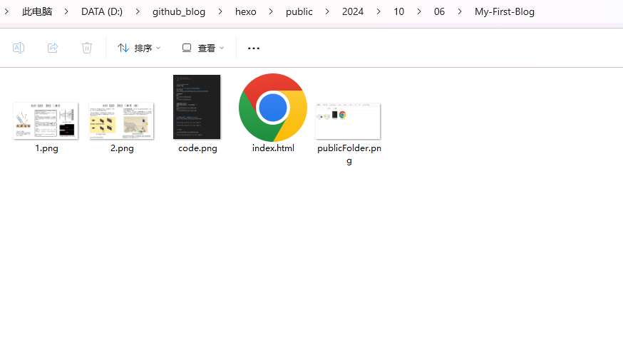 hexo generate 之后,会在hexo/public/2024/10/06/My-First-Blog/文件夹下,生成相关的index.html页面以及相关的图片附件